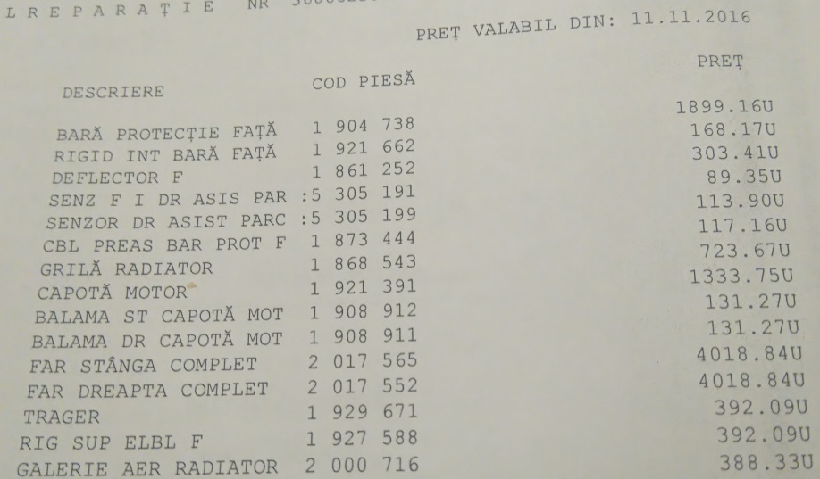 1. 7 noiembrie, nu cred ca as exagera prin adaugirea <<anul curent>>, dupa primirea acordului de intrare in service de la Generali, ma prezint la receptia respectivului "atelier", mentionez ca las masina din respectivul moment in ideea de a-i fi facuta reconstatarea cat mai repede, sperand sa o primesc pana la sfarsit de luna (nu are de-a face cu "atelierul", insa pentru a avea o imagine cat mai exacta, inca eram sub socul avut cu o zi inainte cand nu acordasez prioritate, urmarile observandu-se mai jos)