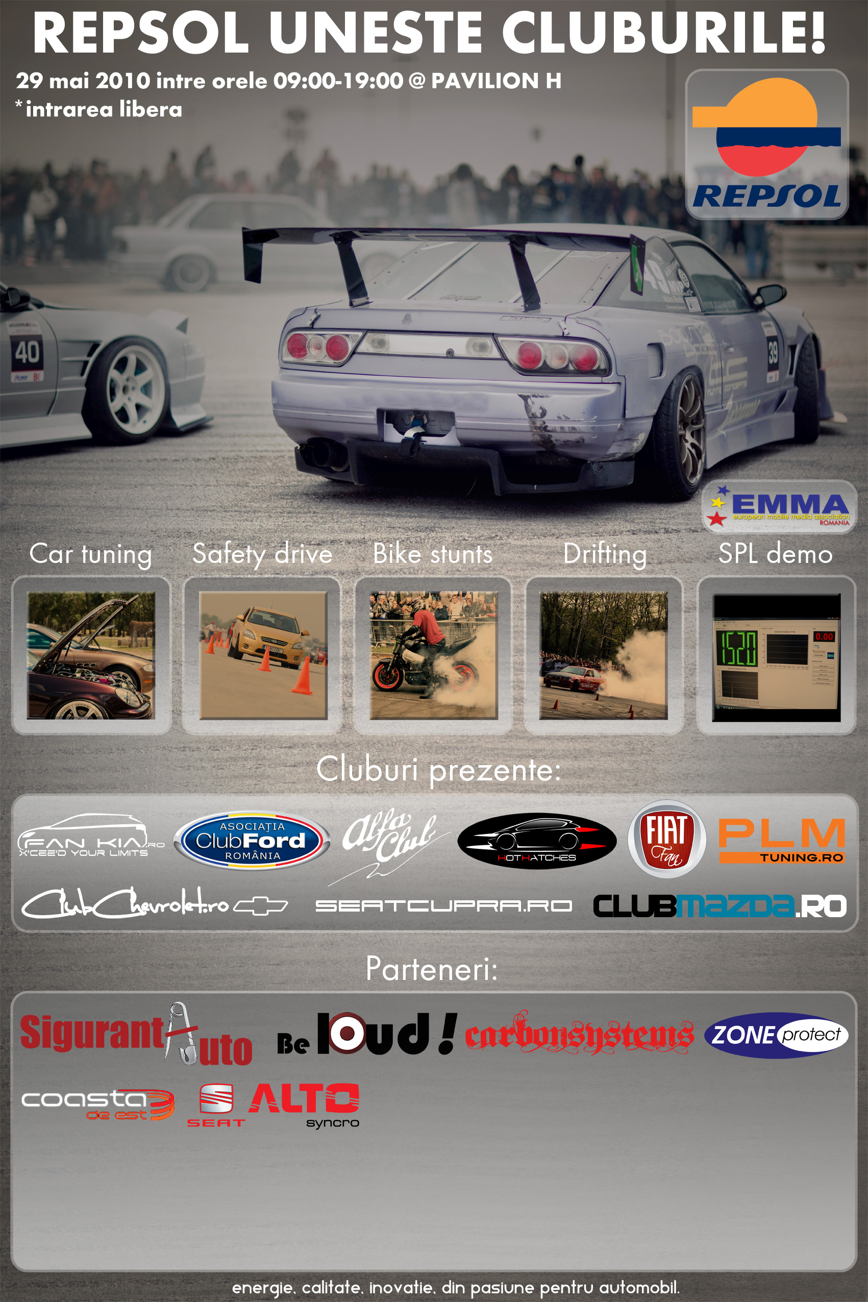 "Pentru prima data in romania cluburile auto se unesc pentru a va oferi un eveniment de neuitat sustinut de Repsol, care incurajeaza si promoveaza caii putere fie ca sunt pe doua sau pe patru roti.