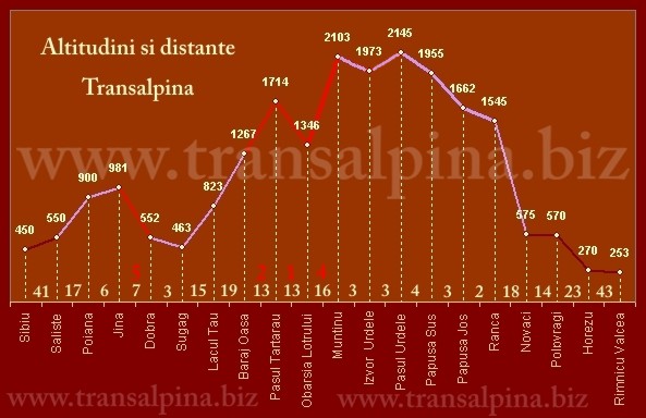 Transalpina altitudini si distanteCu rosu sunt marcate pe grafic zonele din Transalpina care mai au km neasfaltati, km trecuti deasemenea cu rosu, deasupra distantelor trecute cu galben intre localitati.
