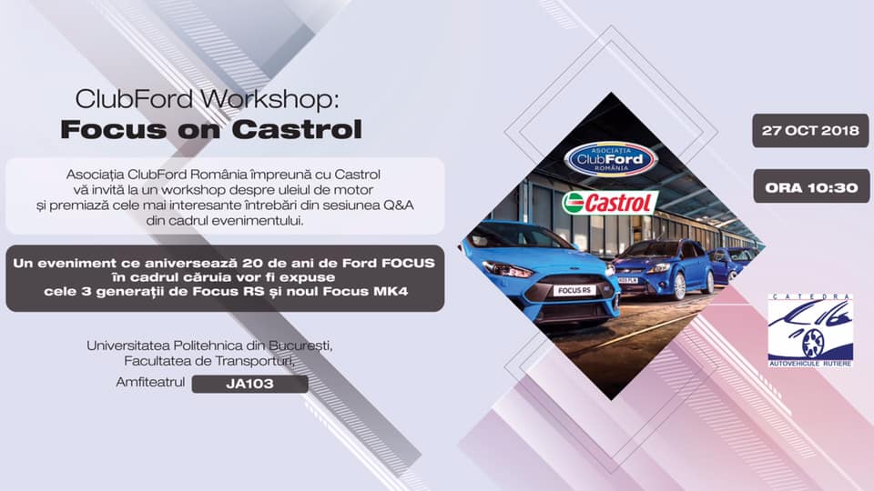 ClubFord Romania, în colaborare cu Castrol Romania, în găzduirea Facultăţii de Transporturi, va organiza pe 27 octombrie 2018 un seminar despre uleiuri si lubrifianți auto. Revenim în amfiteatrul JA103 pentru a învăța despre uleiul din motorul mașinii de zi cu zi, pentru a demonta mituri, pentru a întreba și a ne lămuri curiozitățile.