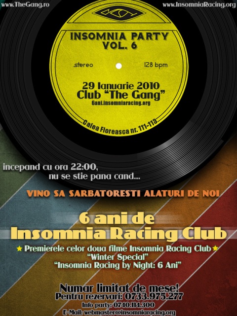 Insomnia Racing Club revine cu a 6-a petrecere aniversara pe data de 29 Ianuarie 2010! Petrecerea va avea loc in clubul "The Gang" de pe Calea Floreasca 111-113, Sector 1, Bucuresti.