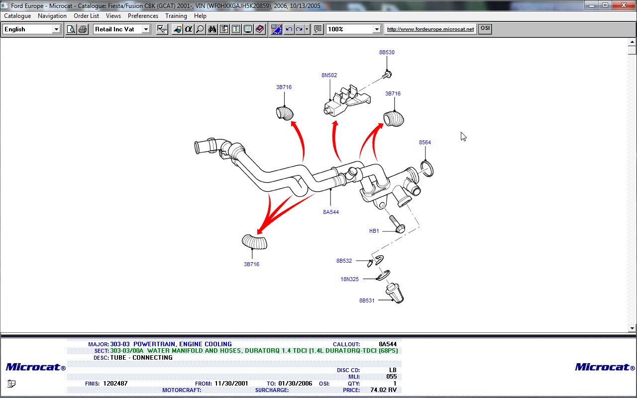 Salut prieteni ! Va rog daca are cineva instalat programul Microcat sa ma ajute sa identific dupa cod (FINIS sau altul) o piesa pentru o Fiesta 1,4 Tdci 2005 (VIN : WF0HXXGAJH5K20859).Piesa este un tub (furtun) de la sistemul de racire care pleaca din termostat si merge undeva in spatele motorului. Acolo sunt doua tuburi . Cel de jos este fisurat si pierd antigel. Atasez o poza . Va multumesc.
