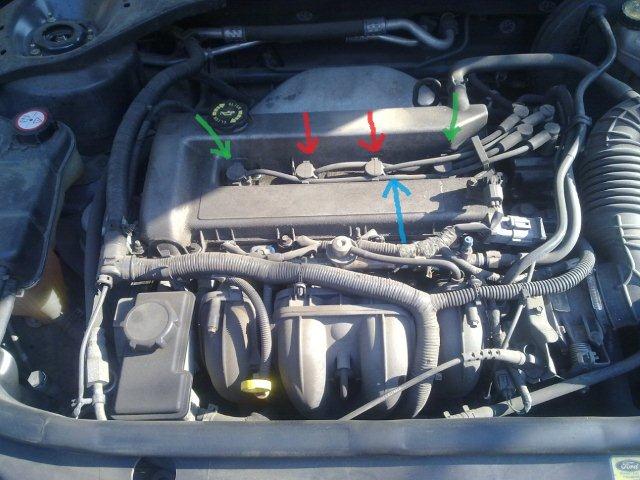 Am scos fisele de la bujii (am avut ieri umpic de timp liber si am vrut sa mai verific una/alta...) si am remarcat urmatorul lucru: la bujiile 2 si 3 (cum ma uitam eu din fata masinii) balteste ulei pana la nivelul filetului bujiilor (Am marcat cu sageti rosii in poza. Uleiul nu este negru, e un maroniu inchis...). La bujiile 1 si 4 totul era curat/uscat, doar o usoara pelicula de ulei pe peretii capacului (am marcat cu verde). Mai supureaza umpic de ulei la exterior, in dreptul unui surub de prindere al capacului (am marcat cu albastru)...