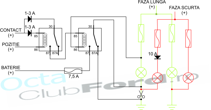 Cei ce au becuri H4 in faruri trebuie sa ia in considerare toata schema. Cei ce au becuri cu un singur filament si proiectoare diferite pt. fiecare faza, trebuie sa ia in considerare doar ce e desenat cu negru si verde.
