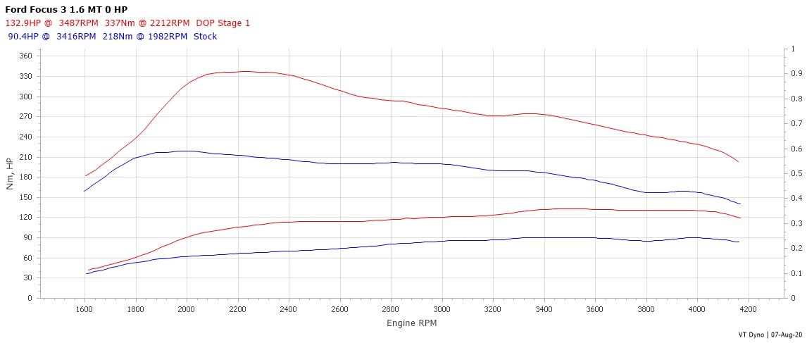 Pentru cine mai are indoieli, mai jos aveti grafic de la dyno facut azi la Dop Motorsport (ii gasiti pe Facebook). E vorba de masina personala, un Focus 3 2013 1.6TDCI de 95 de cai in talon (masurat la 90CP dupa fisa dyno, la aproape 90.000km). Cu informatiile de la Celtic Tuning si de pe topicul asta, m-am dus glont si le-am zis ca fara 130 de cai nu plec acasa :)