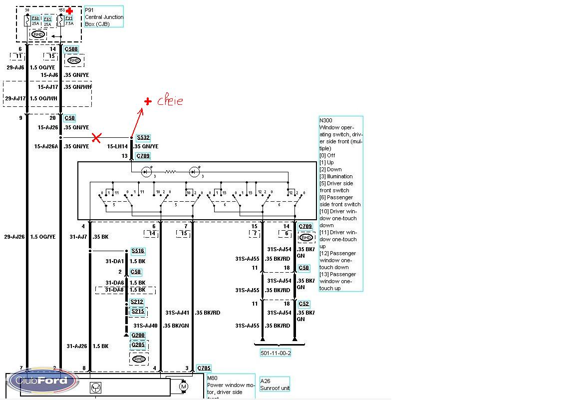Analizand schema mai amanuntit, am observat ca sigurantele F60 (geamuri fata) si F61 (geamuri spate) sunt deja pe plus permanent. Pt ca sa deschida geamul fara cheie ar trebui ca siguranta F91 sa fie pe plus permanent - dar atunci vor sta aprinse permanent ledurile de la butoane