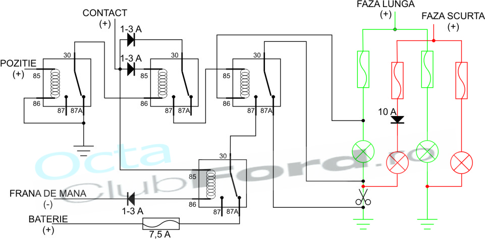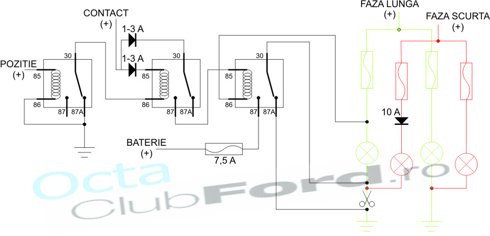 Cei ce au becuri H4 in faruri trebuie sa ia in considerare toata schema. Cei ce au becuri cu un singur filament si proiectoare diferite pt. fiecare faza, trebuie sa ia in considerare doar ce e desenat cu negru si verde.