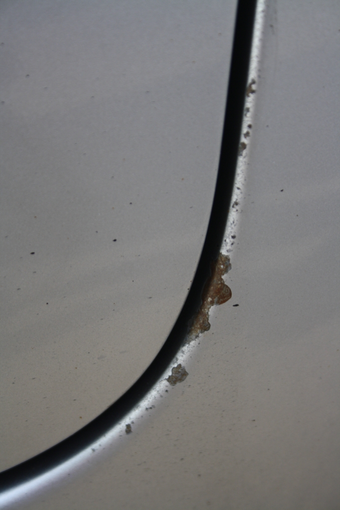 Dupa o buna parte din iarna trecuta petrecuta in nord-vestul Germaniei unde se da la greu cu solutie de dezapezire pe autostrazi, in aceasta primavara m-am trezit cu vopseaua exfoliata si ceva rugina deasupra pragului langa usa din spate stanga. Masina avand sub 5 ani nu mare mi-a fost mirarea. Uitandu-ma cu atentie am remarcat ca usa respectiva e mai "bagata" si atunci apa aruncata de roata din fata ajunge sa loveasca in acel colt in loc sa fie aruncata in exterior cum se intampla in partea dreapta (capatul usii din dreapta e mai scos in exterior).