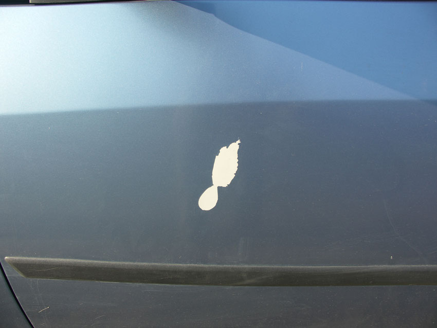 La o spalare facuta de "je", masinii mele i s-a exfoliat vopseaua pe o suprafata de cca 4cm patrati pe mijlocul usii soferului. Se vedea ca dracu: o pata alba, relativ ovala, cu un motz intr-o parte, inclinata la 30 de grade, pe o usa de culoare albastru metalizat. Cand am auzit ca vopsirea ma costa minim 4-4,5 milioane, am creat din autocolant un model si am lipit autocolant, astfel incat sa protejez zona de rugina. Cost: zero. Am atasat pozele ca sa vezi cum arata inainte "buba" si cum arata masina dupa colare (este poza pe care am facut simularea de colare, dar arata exact ca in imagine).