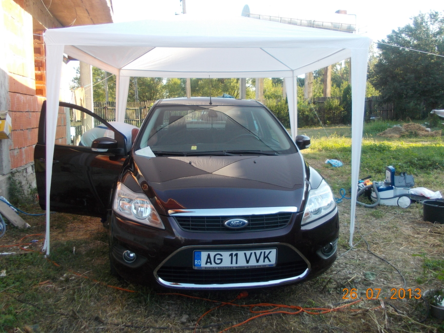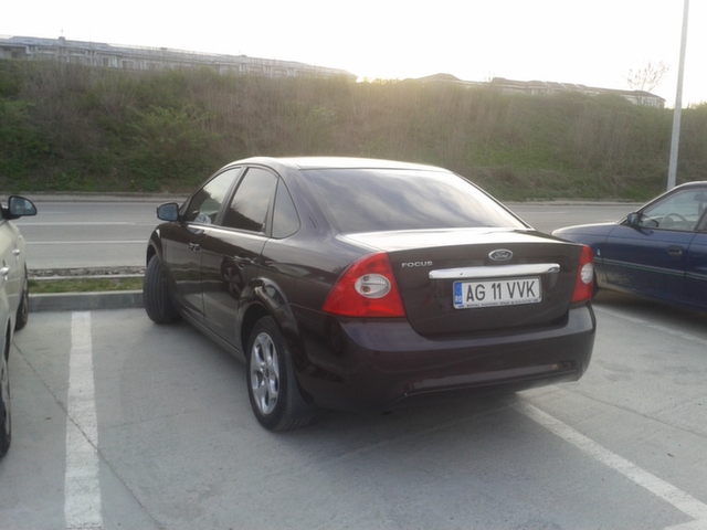 Cand am luat decizia sa achizitionam o masina personala (de foarte mult timp am masina de serviciu), stiam ca o sa fie Ford Focus sedan cat mai dotat. Mai avusesem contact cu un focus 1.4 sedan de la serviciu si un 1.6 90CP diesel hatch, pe care l-am cumparat de nou pentru cineva si deci nu concepeam alt model. La un moment dat, dupa ce vazusem destule masini si batusem netul in lung si-n lat, un amic, dealer de masini sh, mi-a spus ca are un focus si m-a invitat sa-l vad. Masina fusese luata la pachet cu mai multe utilitare(se terminase leasingul) si avea 60.000KM. Cand am auzit ca este trend si motor pe benzina, recunosc, nu m-a incantat. Dar dupa ce m-am mai gandit si am verificat-o la dealerul de unde fusese cumparata si servisata( oamenii mi-au spus ca o cunosc si ca nu a avut nici o problema) am decis sa o cumpar. Atasez o imagine de la prima intalnire: