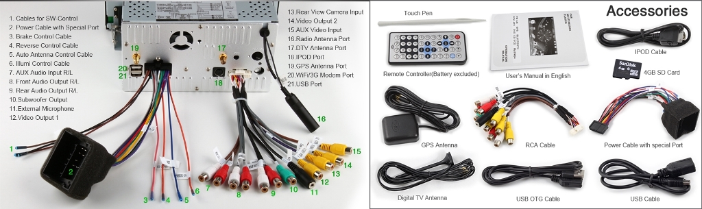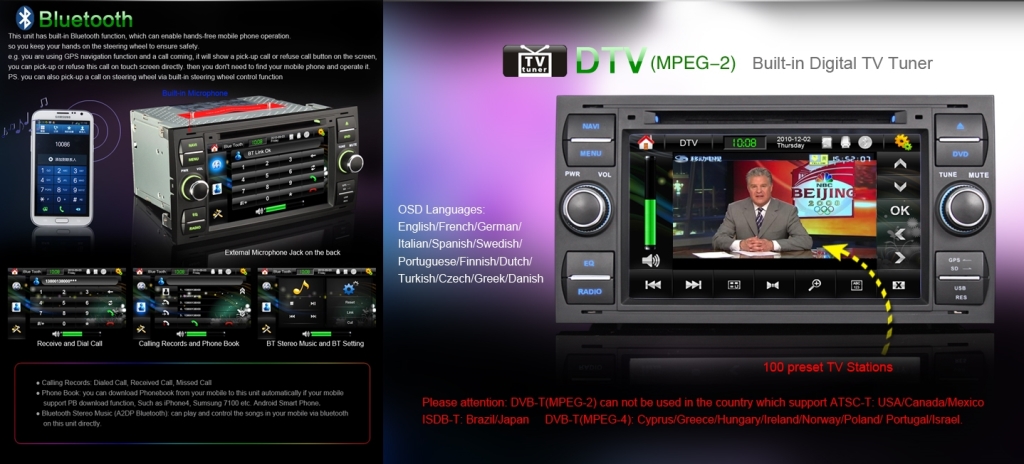 This unit is the latest AllinOne Design for FORD, it has beautiful appearance with colorillumination and can good match with original car, also it has built in the most popular and strongest function: HD Digital Touch Screen, fast response speed, Subwoofer adjustable, Dual Zone, Slide Menu, 3D Rotating Screen Menu, Picture in Picture, Steering Wheel Control, Support 720P RMVB (MP5) and Virtual 8 Discs, OpenUnitAnimation, Real Clock, DVBT Tuner, GPS Navigation, Radio RDS, A2DP Bluetooth, Bluetooth PiP, IPOD Audio Input and Control, Ebook, Games, Calendar, WiFi & 3G Internet Ready, USB, SD etc.
