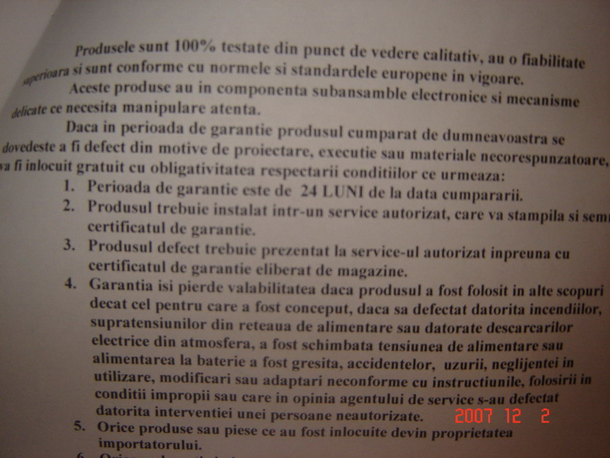 > sistemul e cumparat de la comenzi.ro, va dau factura (in copie) si certificat de garantie (original); are garantie pana in august 2009, cu conditia sa fie montat in service autorizat
