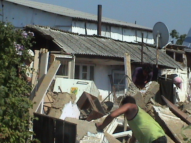 Vineri seara am ajuns acasa( Eu , Dan si Dinu) la ora 1 sau 2 dimineata, dupa ce am stat ore bune la cumparaturi. Sambata dimineata a inceput maratonul. La ora 8 jumatate m-am intalnit cu Negrutzu si cu prietenul lui Bogdan(multumim de ajutor) si am inceput sa facem planul. Ora 9 jumatate ne gaseste in Real, unde am intrat la o noua serie de cumparaturi. Dupa ceva discutii organizatorice, am trecut la facut pachete, in plin parc, in vazul tuturor. Primul tip de pachete a fost format din: 1 sapun, 1 prosopel, 2 role hartie igienica, 3 pateuri, 1 conserva de peste si 1 conserva carne si o paine. Acestea au fost primele 100 de pachete. In total, am ajuns la 300 de pachete, care nu au fost toate la fel dar, zic eu, au fost echilibrate valoric si nutritional. Cam pe la ora 15, dupa ce toate pachetele au fost facute si au fost puse in dubita, am plecat in coloana spre Saucesti. Asa cum am povestit si mai devreme, actiunea noastra a fost completata si de aportul preotului din comuna. Parintele a mers cu noi pe la fiecare casa, multe dintre ele nu mai putand fi numite case, si am impartit pachetele. Pe o caldura inabusitoare, un miros de apa imputita care iti intorcea stomacul pe dos, printre lacrimi si ruine am mers prin sat pana am impartit toate pachetele. Toate cazurile au fost socante, dar doua dintre ele au fost pur si simplu cutremuratoare. Un batran de peste 70 de ani, a rams doar cu intrarea de la casa in picioare, sa zic o suprafata de 3mp , pentru ca omul dormea intins pe o bucata de placaj, pusa pe diagonala intrarii, astfel incat sa incapa in acel loc ingust. Avea de mancare o jumatate de paine , un pateu si 1 stical de apa de 1,5 litrii. Casa era la pamant. Celalalt caz cutremurator, a fost cand 2 femei cam de aceasi varsta cu domnul anterior, au inceput sa planga ca nu pot imparti ultimul bidon de apa. Nici unii dintre acesti oameni nu au venit la noi la masina sa ne ceara pachete, chiar batranul refuzand hainele zicand ca sa dam la altii mai necajiti decat el. Existau si mai necajiti.