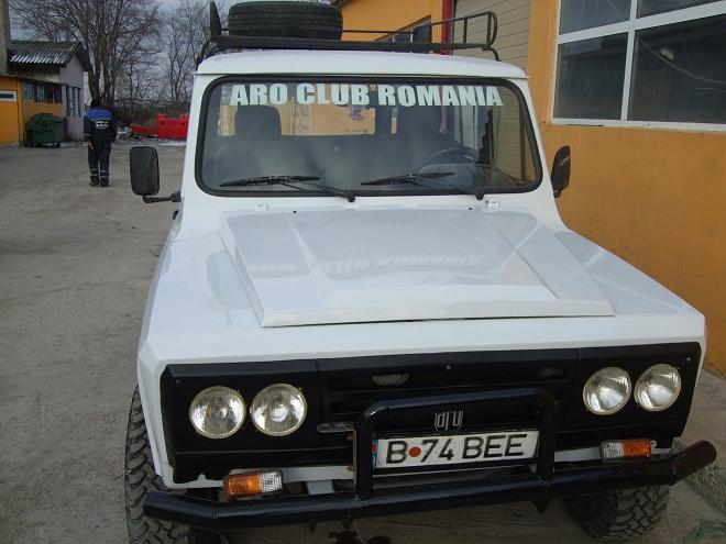 ARO 244 culoare alb, numar de inmatriculare B-74-BEE, motorizare Brasov (diesel aspirat 3119 cmc), jante 15 intoarse cu anvelope BFG MT KN1, portbagaj custom pe toata suprafata plafonului si rezerva pe portbagaj.