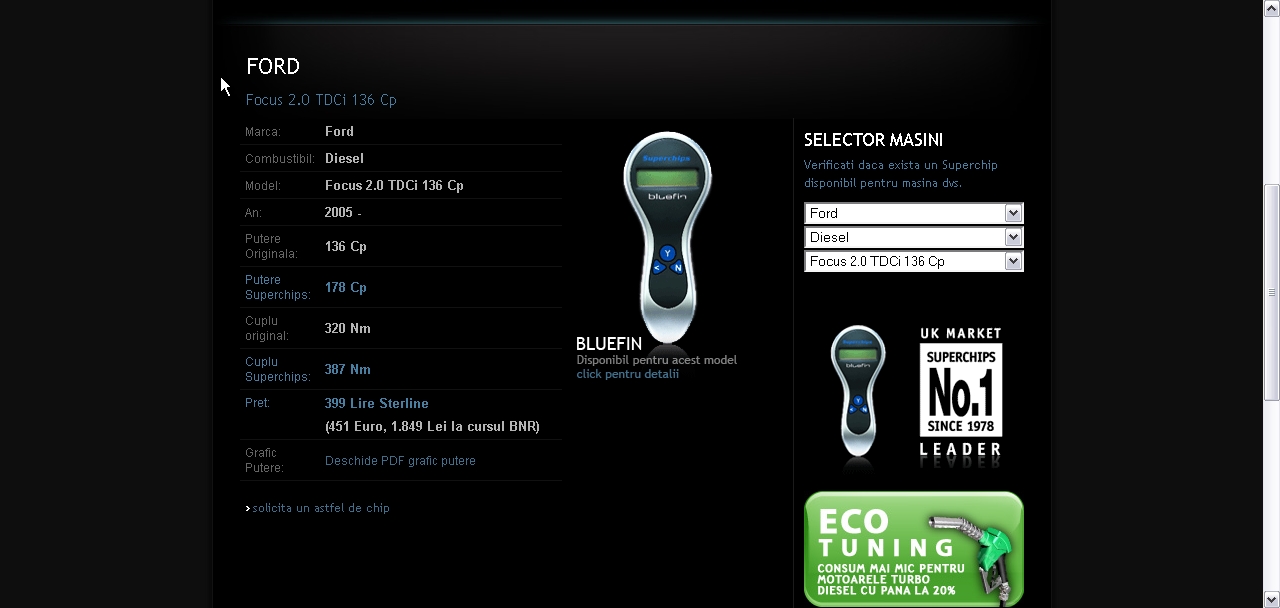 De asemenea in premiera pentru piata din Romania, Superchips ofera Bluefin, un dispozitiv electronic prin intermediul caruia fiecare isi poate modifica singur masina in cateva minute. Pretul unui dispozitiv Bluefin este intre 299 si 499 lire sterline (TVA inclus) + transport. Mai multe detalii despre Bluefin gasiti aici: http://www.superchips.ro/website/Bluefin.html